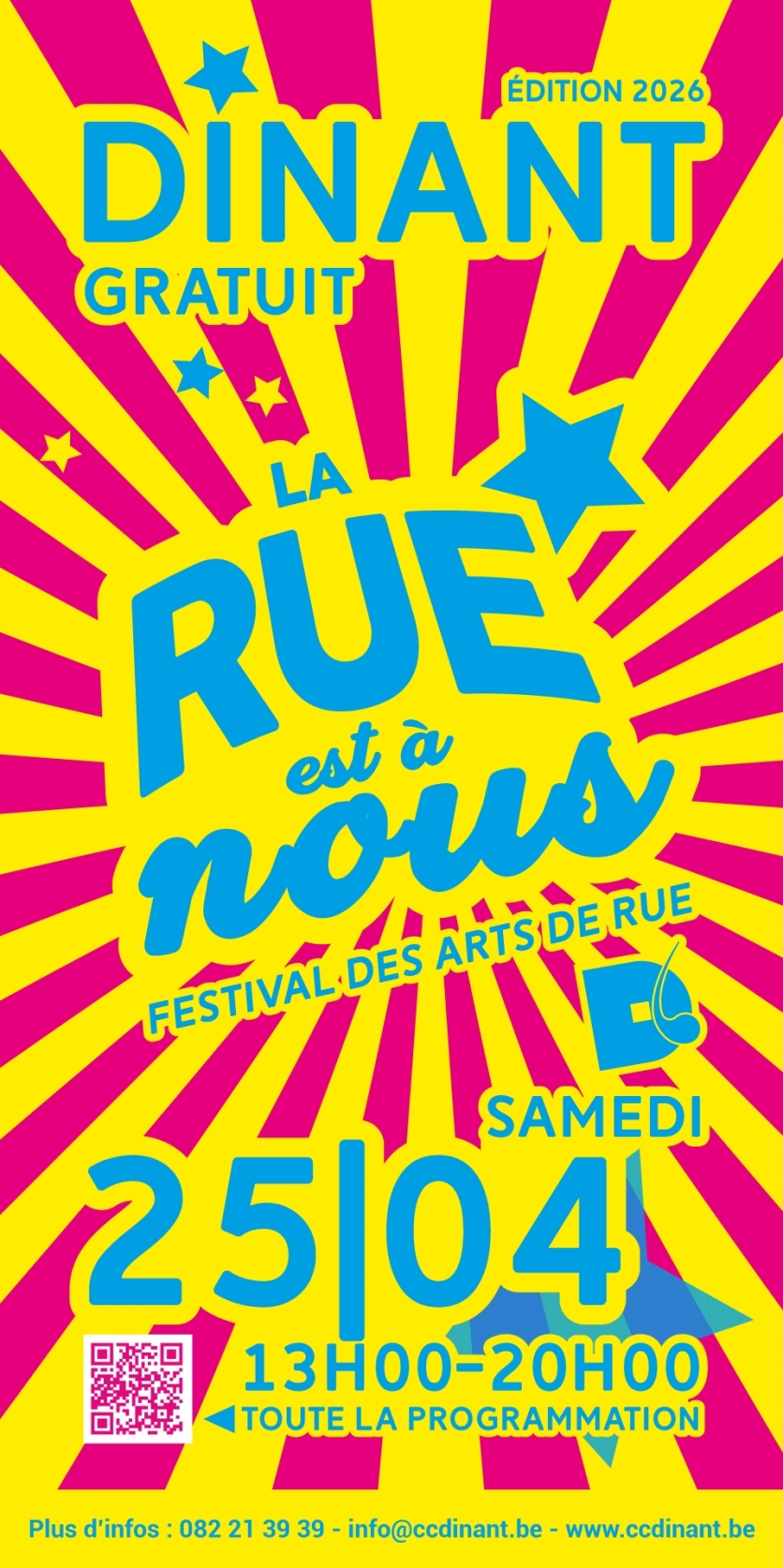 Pensé comme un moment de partage et de rencontre, La rue est à nous vise à rapprocher le public des artistes en sortant la culture des lieux traditionnels. Petits et grands pourront ainsi profiter d’animations surprenantes, de spectacles vivants, et d’instants d'émerveillement aux détours des rues. De plus, une foule d’activités créatives, colorées et rigolotes telles que le break-dance, le dessin, et le cirque seront également proposées mais également d’autres plus méconnues du grand public comme le cyclo-danse, la sérigraphie ou encore la peinture collective sur balançoire. Avec cette initiative, soutenue par la Ville de Dinant, le Centre culturel confirme sa volonté de rendre la culture accessible à tous et de dynamiser la vie locale à travers des événements participatifs et ouverts.